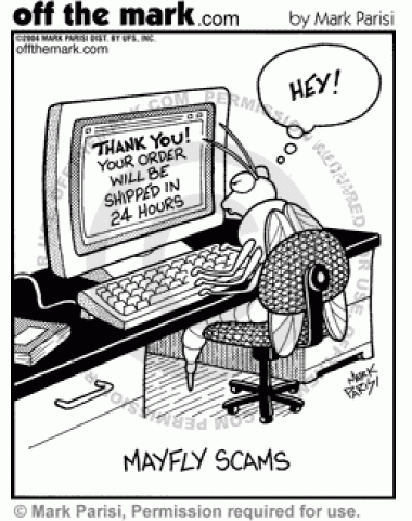 Mayfly Internet Scam A mayfly is scammed on the internet by buying a product that is shipped in 24 hours.