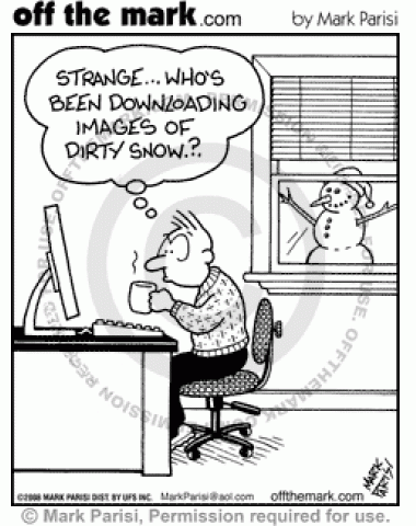 Man wonders who downloaded dirty snow images on his computer while snowman stands outside window.