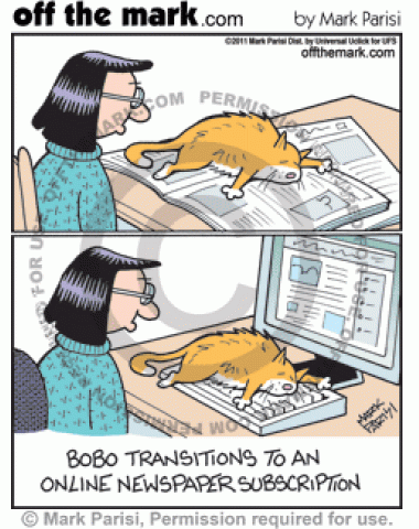 Cat Obstructs Newspaper Cat adapts to technology by sleeping on keyboard instead of newspaper.