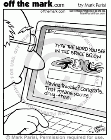 Drug Free Captcha Being unable to read word on web site proves user is drug free.