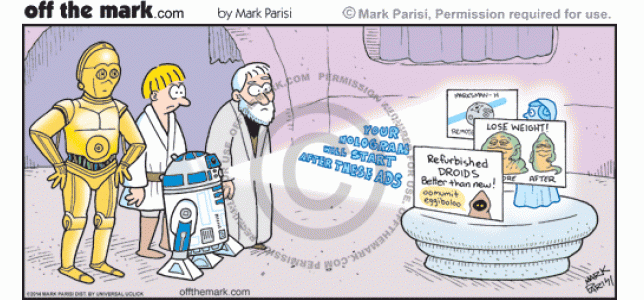 Hologram Ads R2D2 shows advertisements before a hologram.