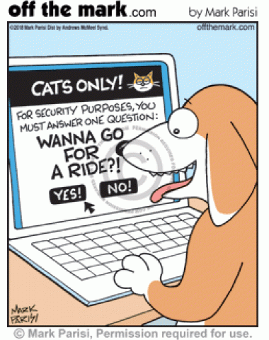 Cats Only Website Dog fails a security question on a cats only website by answering that he’d like to go for a ride.