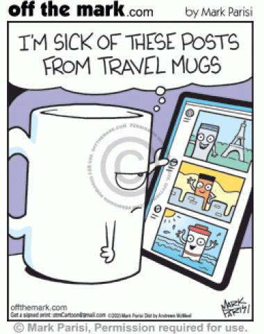 Jealous Coffee Cup Sick Of Online Travel Mug Social Media Posts Annoyed coffee mug on smartphone complains about showoff travel mugs online vacation photos.