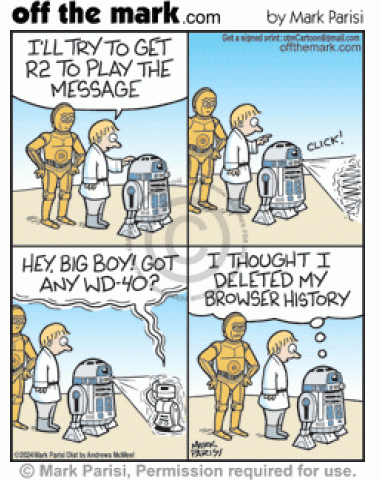 Luke Skywalker & C3-PO try to get R2-D2 to replay message but robot porn video embarrasses droid who thought he deleted browser history.