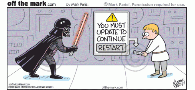 Luke Skywalker’s light saber must update & restart before fighting Darth Vader.