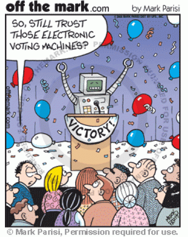 Robot Electronic Election Robot wins election due to unreliable electonic voting machines.