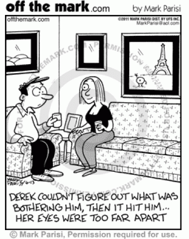 A man dislikes how far apart his date's eyes are -- one in her head, and one in Paris.