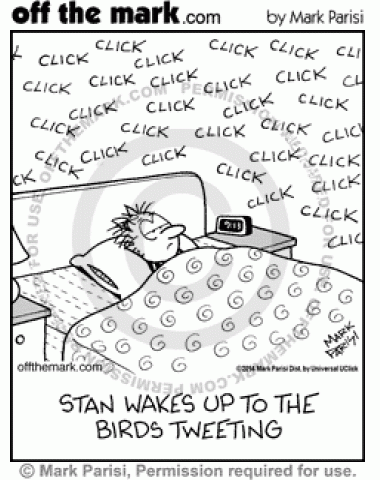 Awakened By Tweets Clicking noises from birds tweeting on Twitter wake a man up.