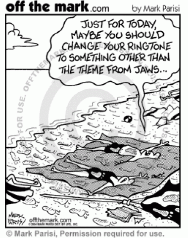A woman's phone has the Jaws theme as her ring tone, causing a panic at the beach.