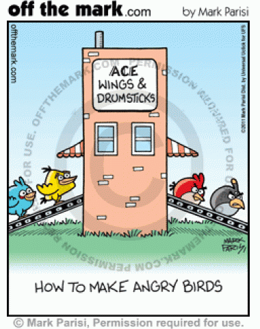Making Angry Birds Angry birds get that way from having their wings and drum sticks removed.
