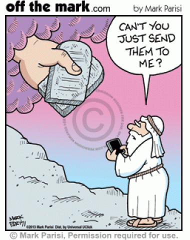 Texting 10 Commandments Moses wants god to text him the commandments instead of giving them to him on tablets.