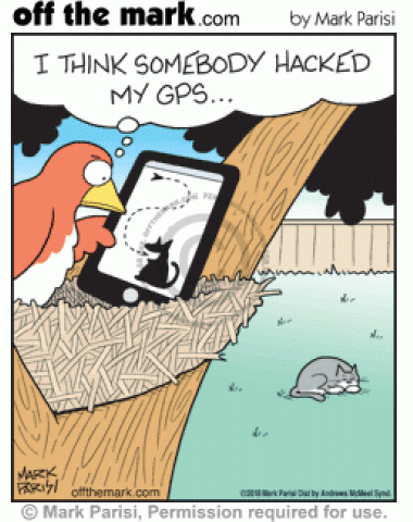 Cat Hacks Bird’s GPS Bird suspects smartphone’s directions hacked leading to a sleeping cat’s mouth.
